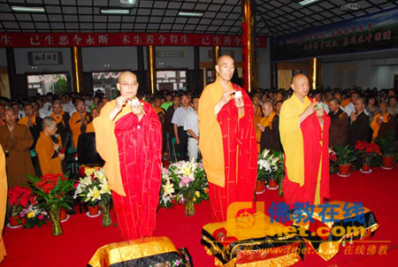 主法法师:监院智超法师(中)监院、佛学院常务副院长贤空法师(左)副寺来正法师