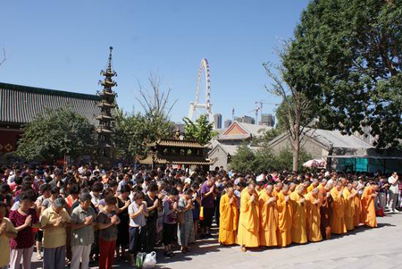 2010年8月15日上午十时,为全国哀悼日,追念甘肃舟曲泥石流遇难同胞,天津大悲禅院钟楼内由常住法师敲响108声钟。
