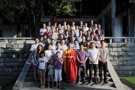 在福严寺方丈楼听大岳法师开示并合影留念后,居室们到大雄宝殿参加了近二个小时的万福大法会。最后,居士们在领取法会纪念品后离去。