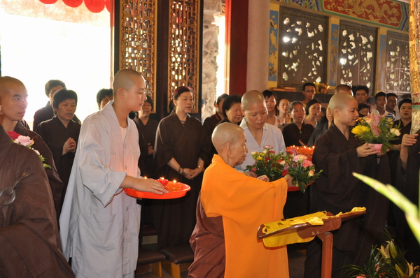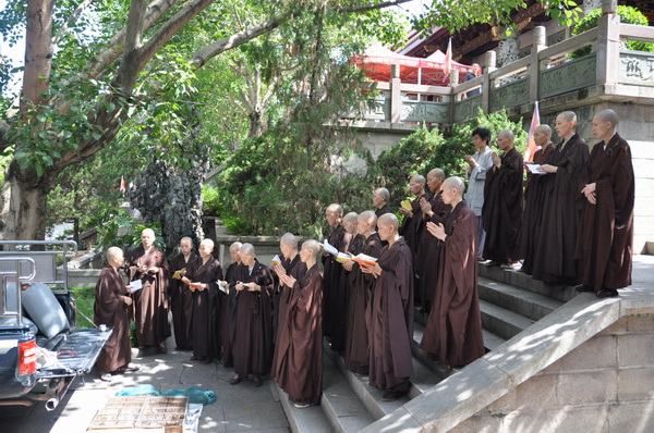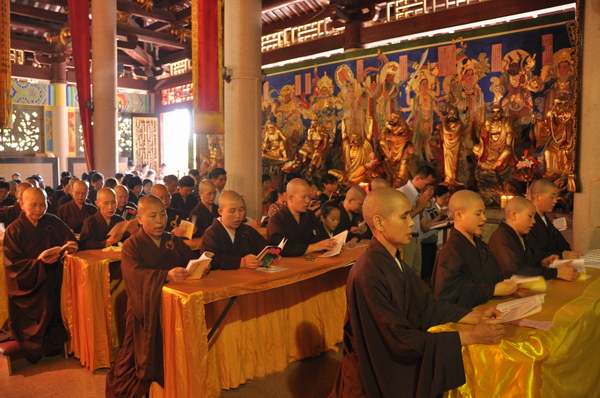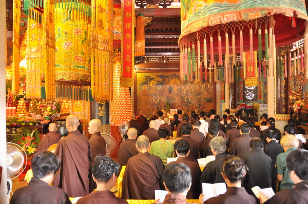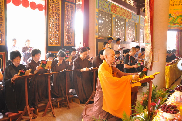 上图为明慧法师与僧众在宝殿内诵《盂兰盆经》。