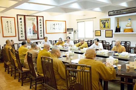 会上,宏满常务副会长宣读了《广东省佛教教职人员资格认定办法(试行)》,与会人员讨论后,一致通过该办法。传正常务副会长向大家通报了广东省创建和谐寺观教堂第一批达标的佛教场所的情况。根据24项细分的考核标准,全省一千四百余处佛教场所将在五年内分批达标。经审核,2010年全省首批达标的佛教场所共有264处。其中广州光孝寺、六榕寺、大佛寺等七处接近或达到120满分。