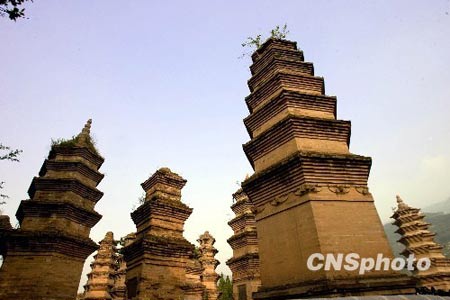 登封“天地之中”历史建筑群自去年申遗失败后,今年再次迎来申遗大考,并成功入选。图为嵩山历史建筑群中的少林寺塔林,少林寺塔林是中国现有古塔数量最多的墓塔林,面积2.1万余平方米,现存自唐贞元七年(791年)至清嘉庆八年(1803年)之间的唐、宋、金、元、明、清各代砖石墓塔241座建筑。(图片来源:中新社 王中举 摄)