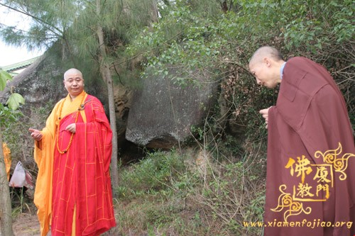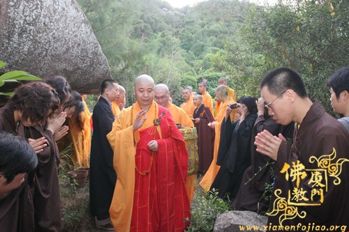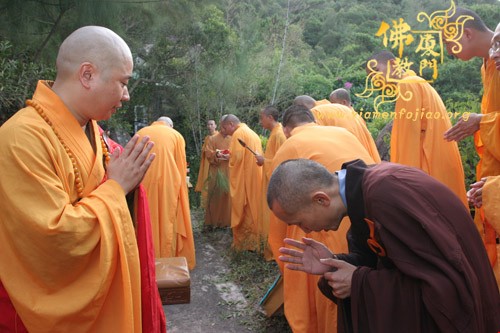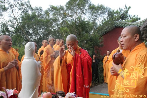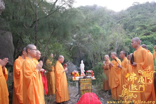 今天早上6时30分,则悟大和尚率南普陀寺副寺兼大知客德煌法师、知客源提法师、常住悦众及护法居士等至闭关房前,在临时设置好的供桌前拈香礼佛,讽诵真言,并开示法语:
