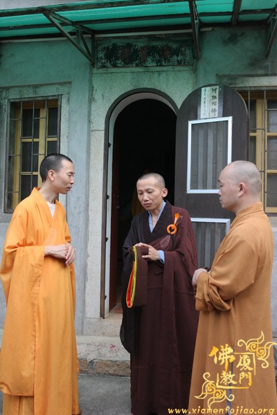 南普陀寺副寺兼大知客德煌法师和知客源提法师与悟鼎法师交谈