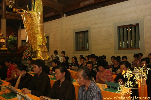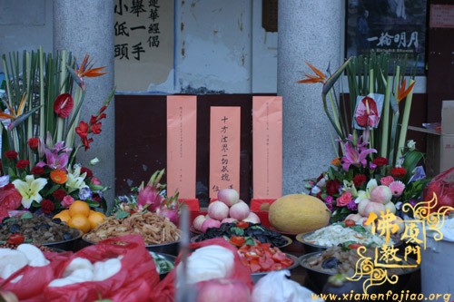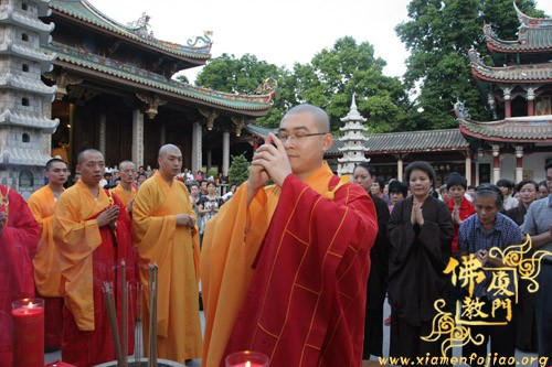 是日晚6时许,南普陀寺备办丰盛果品、饮食,在大雄宝殿施放五大士瑜伽焰口,由南普陀寺维那圆满法师等主法,法会现场庄严肃穆。