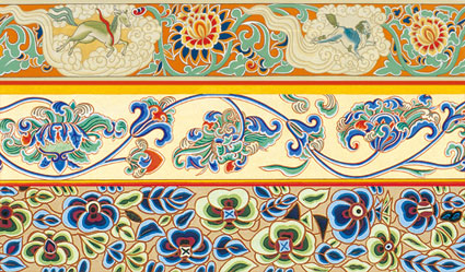 “边饰”: 在壁画中,边饰是画面与画面的分界装饰带,在石窟墙面上根据所绘题材的不同进行合理分割组合墙面,为专题性壁画内容划分领地。