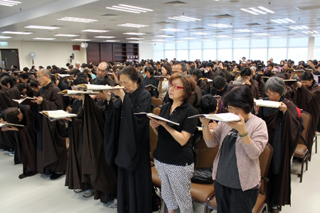 听闻香港佛光道场为罹难者举办法会的讯息后,不少港人前往参加法会,28日超过1200位民众与信众涌进道场的十五楼大雄宝殿及十六楼的大斋堂。主法者慧诚法师的梵呗摄心感人,当诵至“启告十方……”时,大众无不深被摄受,感动落泪,希望此次罹难者,能莅临坛场听闻佛法,远离恐怖而往生极乐净土。(文:邓永明 图:余兆晟 )