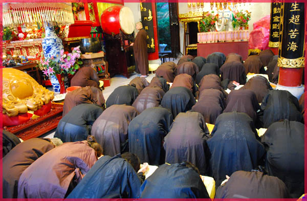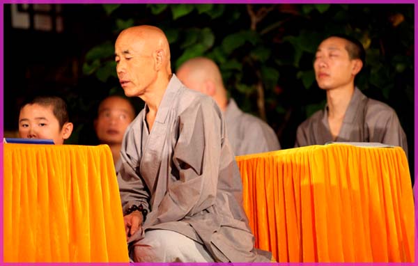 农历七月十四这天,上传下喜恩师率四众弟子恭颂《盂兰盆经》,晚上进行心灵讲座 暨蒙山甘露施食超荐法会。
