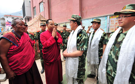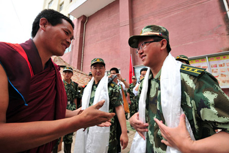 甘肃省甘南藏族自治州舟曲县特大山洪泥石流灾害发生后,武警部队官兵及时赶到灾区抢险救灾,全力抢救群众生命,保护群众安全。2010年8月18日,舟曲最大的寺院黑峪寺以及夏河县拉卜楞寺、西安广仁寺的僧人特意到舟曲县城向武警官兵表示敬意。(图:梁强)