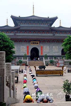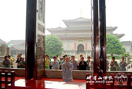 2010年8月17日早上,由中国佛学院悟实法师率领的北京、河北、山东等地信众一行43人,从峨眉山大佛禅院引门大光明楼开始,口诵“南无大行普贤菩萨”,三步一拜,身体力行,朝礼四川峨眉山大佛禅院。