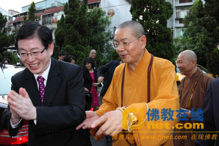 2010年9月16日,国家宗教事务局局长王作安率大陆宗教交流团一行,16晚间拜会台湾‘慈法禅寺’,受到住持净耀法师与中华佛教居士会理事长陈声汉、万福禅寺住持明空法师、妙泉寺住持修懿法师等各佛教寺庙、团体僧俗四众热烈的欢迎。(图文:丁志勇)