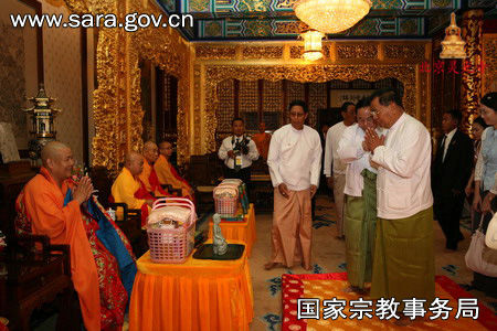 9月8日上午,应胡锦涛主席邀请来华访问的缅甸联邦国家和平与发展委员会主席丹瑞与夫人一行赴灵光寺参拜佛牙舍利,在外交部、我局及中国佛协的指导下,灵光寺方丈常藏法师率灵光寺四众弟子予以热烈欢迎和热情接待,活动进展顺利圆满。
