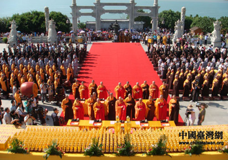 开光法会由普陀山佛教协会会长、普济禅寺方丈道慈法师与台湾圆尘法师、传孝法师共同主持,来自两岸的佛教界人士和信众共1000余人共同见证了这一具有历史意义的时刻。