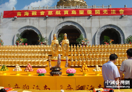 近日,普陀山佛教协会在观音圣地浙江普陀山南海观音大佛广场举行了隆重的“南海观音慈航宝岛”圣像开光法会,为即将于27日启程送往台湾观音“四大法脉”月眉山、法云寺、观音山、大岗山千处寺院敬奉的1000尊南海观音像开光。