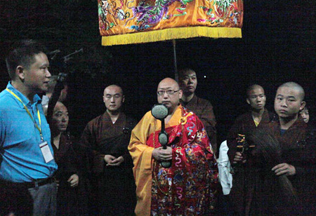 凌晨四点,钟鼓齐鸣,排列整齐的仪仗队在山门恭请传实法师法驾