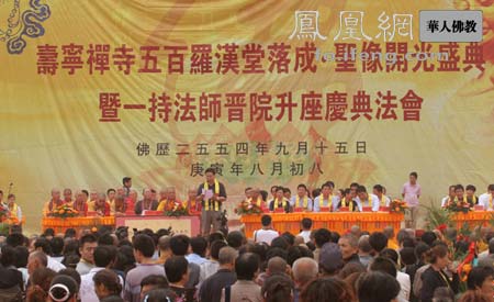 2010年9月15日,适逢农历八月初八,山西省清徐县千年古刹寿宁寺迎来了隆重的佛门盛事——全国最大五百罗汉堂圣像开光暨一持法师荣升寿宁寺方丈庆典法会。值此吉日,古刹重兴,海众云集,天人同贺,因缘殊胜。