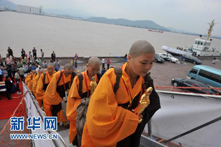 在舟山定海老塘山码头,“南海观音慈航宝岛”护送团僧尼手捧观音圣像登上游轮
