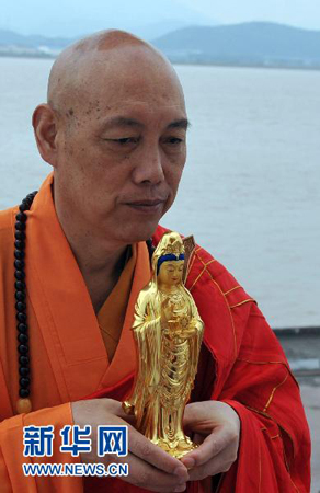在舟山定海老塘山码头,普陀山佛教协会会长、普济禅寺方丈道慈大和尚手捧观音圣像登上游轮
