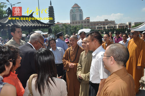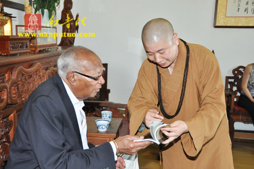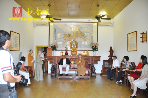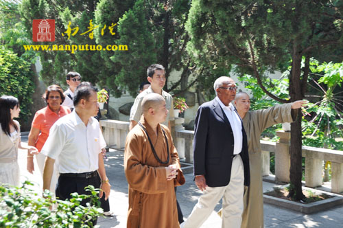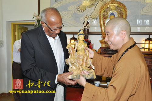厦门市佛教协会会长、南普陀寺方丈则悟大和尚,南普陀寺监院界象法师、知客德煌法师、书记圣智法师等在天王殿前热情的接待了理查兹夫妇。则悟大和尚陪同外宾参观了南普陀寺天王殿、大雄宝殿、大悲殿等处。随后,宾主双方在方丈楼进行了亲切友好的交谈,大和尚代表常住将一尊陶制观音像赠予理查兹夫妇以作纪念。南普陀寺书记圣智法师担任此次活动的英文翻译。