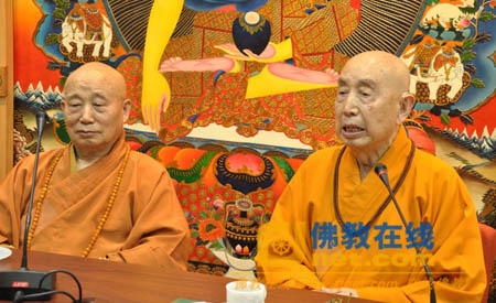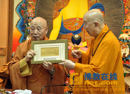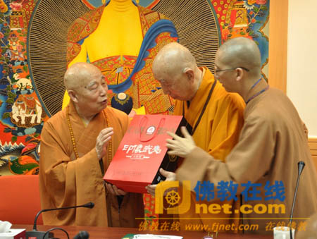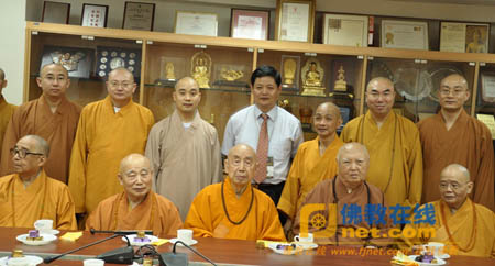 中佛协副秘书长演觉法师,中佛协教务部主任宏度法师,中佛协综合研究室明杰主任,中国佛学院副院长兼教务长宗性法师,会长秘书性然法师、可潜法师陪同拜会。