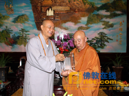 新加坡佛教总会主席广声法师向传印会长赠送礼物