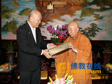 新加坡佛教居士林林长李木源居士向传印会长赠送礼物