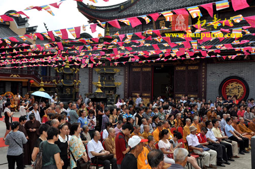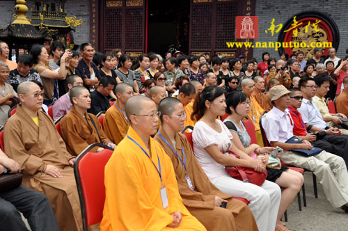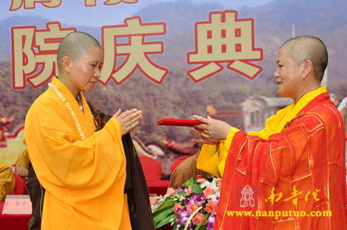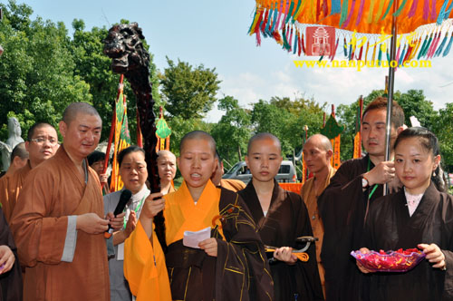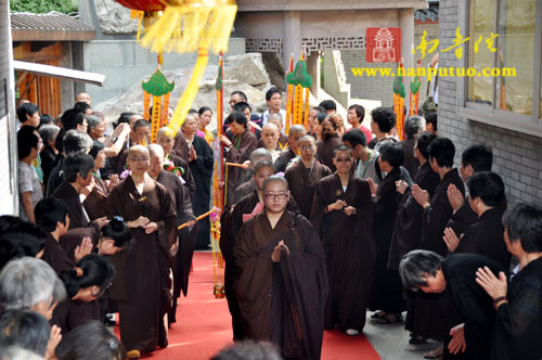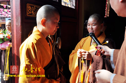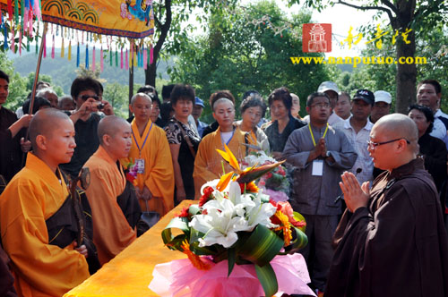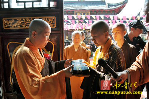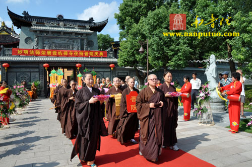 上午9时30分,霞屿禅寺内钟鼓齐鸣,人潮涌动,妙明法师在霞屿禅寺两序大众的迎请下,缓步进入山门,由法源法师、超波法师将其护送至大雄宝殿内拈香礼佛,随后,晋院仪式在大殿前举行。可祥大和尚、则悟大和尚、诚信大和尚、法源法师及宁波市宗教局局长耿建光、一处章洪光处长等分别致贺辞。