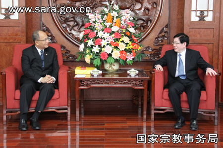 9月6日上午,王作安局长在我局会见了世界佛教徒联谊会(以下简称“世佛联”)秘书长帕洛普·泰阿利先生。 帕洛普先生首先代表“世佛联”主席转达了对王局长接任国家宗教事务局局长一职的问候。邀请我局及中国佛协组派代表团出席今年11月在斯里兰卡召开第25届“世佛联”大会。 王局长对帕洛普先生担任“世佛联”秘书长以来为加强中国佛教界与“世佛联”交流合作所做的努力给予肯定,高度赞扬了“世佛联”总部及帕洛普先生在西藏问题上对我予以的支持,表示今后将继续支持中国佛教界与“世佛联”开展深入交流与合作。