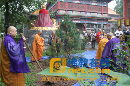 日本天台宗布教师会一行在宽旭法师的引领下,首先到大雄宝殿礼佛并举行诵经祈福法会、到慈觉大师纪念堂礼拜了圆仁法师法相。接着,日本天台宗布教师会一行与宽旭法师一起在文殊殿后方种植了象征中日友好的常青树,在宽旭法师的陪同下到金刚堂参加了寺院举办的地藏王菩萨圣诞法会。