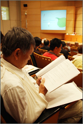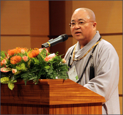 在探讨灾害防治及管理之前,法鼓山方丈果东法师首先发表讲话,他指出气候异常,已是大众普遍感受最深的议题,并从“心灵环保”的角度,强调人类必须正视天灾不断的警讯,改变价值观及生活习惯,若不能少欲知足,感恩大地给予的恩泽,侈谈防洪、减灾都是难以成功的;而所谓价值观的改变,就是把一己自私的立场,转换成为尽心尽力奉献他人,或者是布施他人的观念,以奉献、布施来取代掠夺、争取。