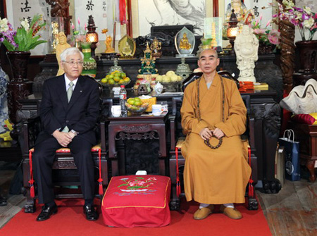 2010年10月19日下午,日本京都银行会长柏原康夫一行16人在宁波望春工业园区管理委员会副主任虞文平等人的陪同下,到浙江省宁波市天童禅寺参访,受到该寺方丈诚信法师的热情接待。宾主双方进行了友好交流。