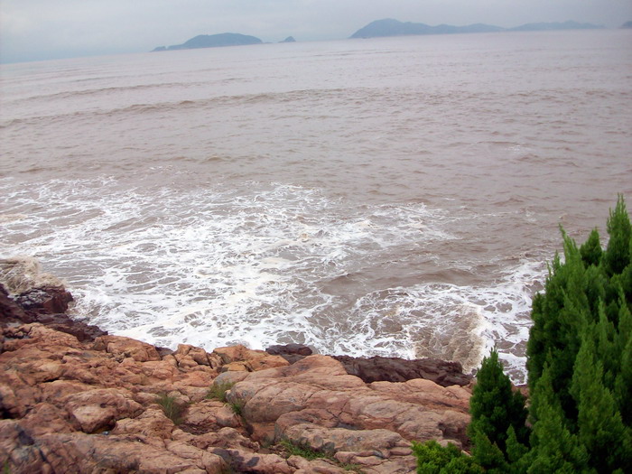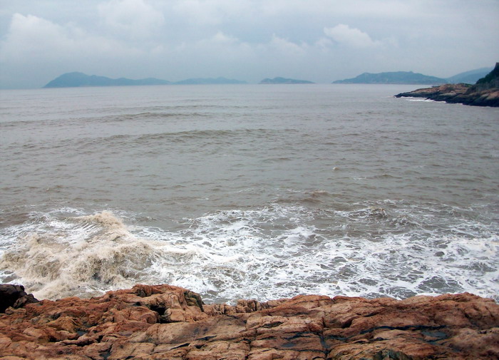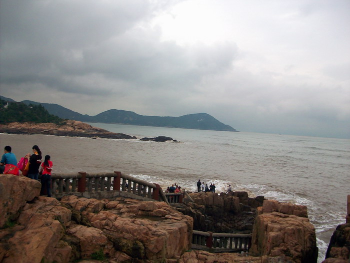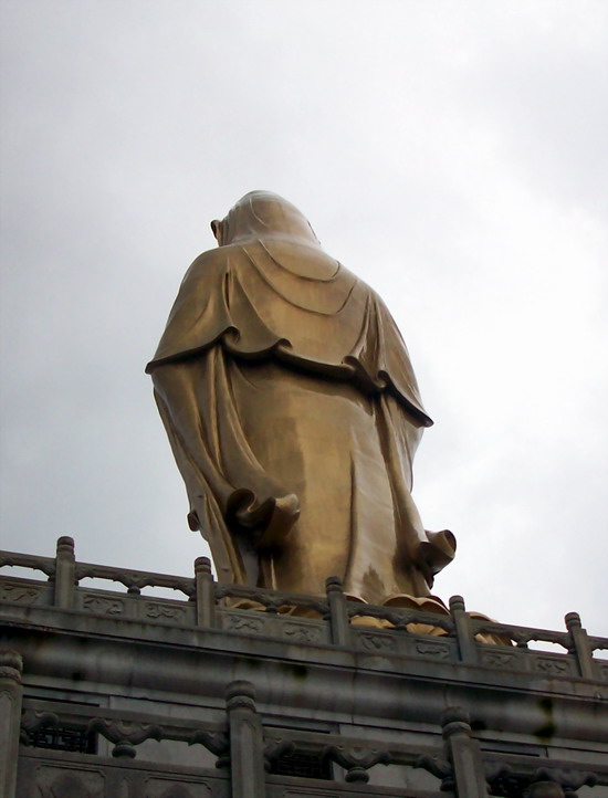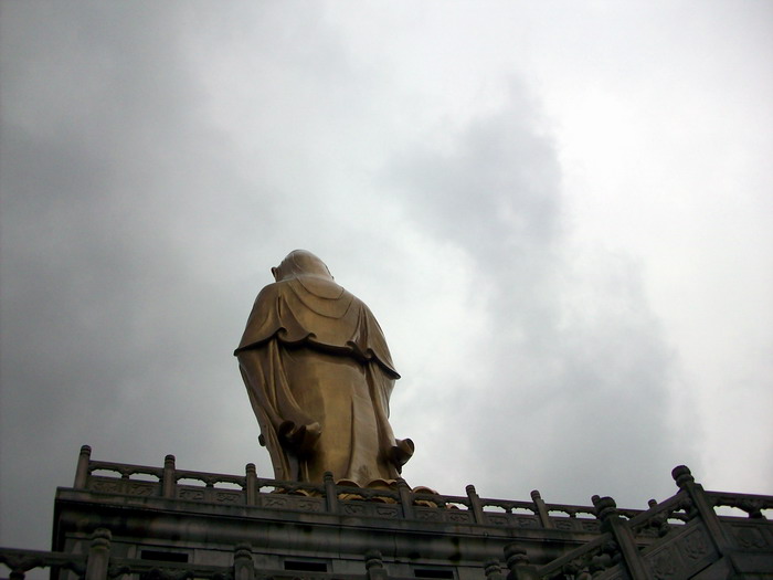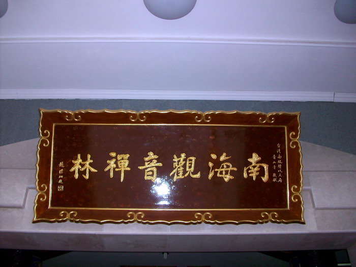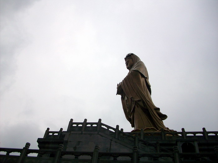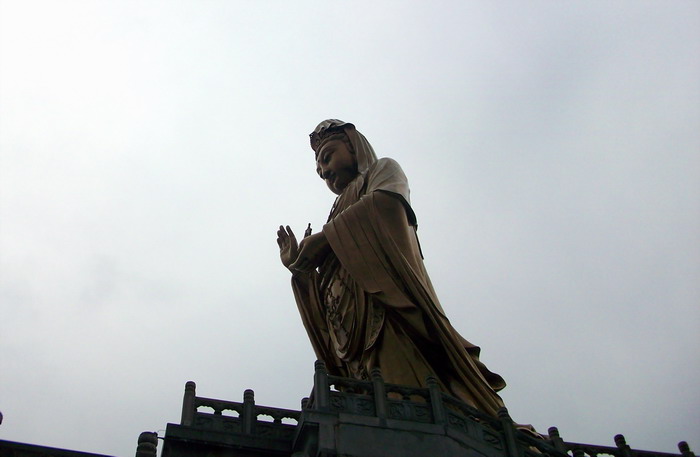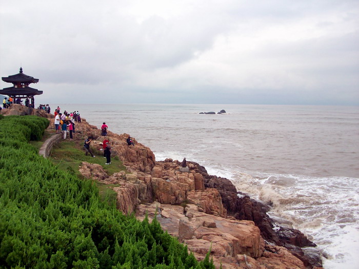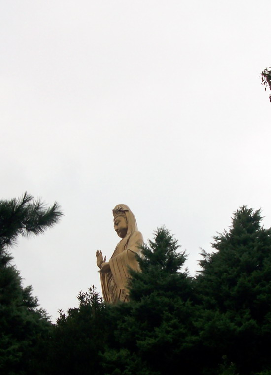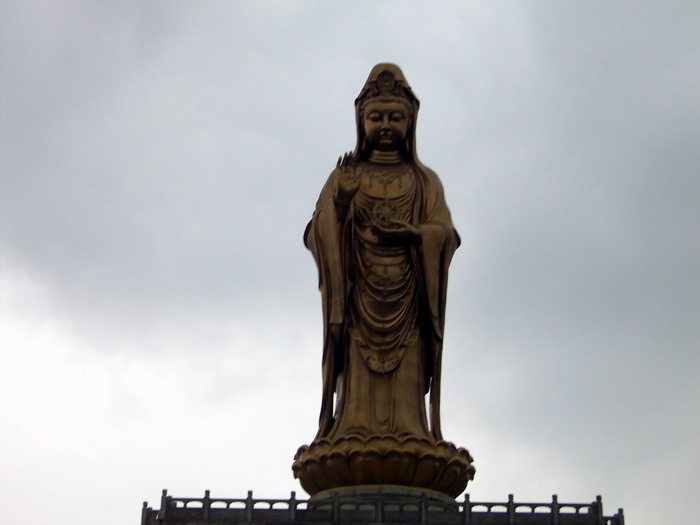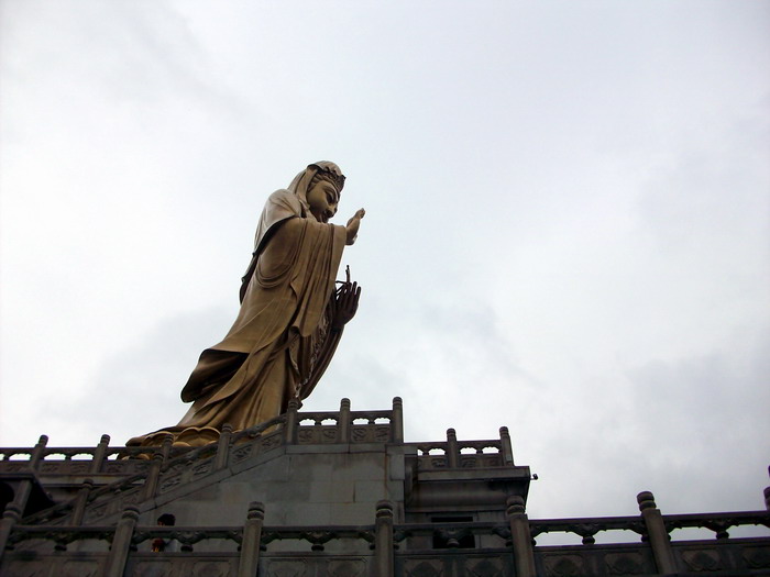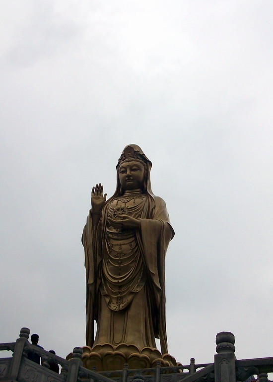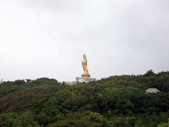 南海观音像,据说这是亚洲第一观音像。立像台座三层,总高33米,整座塑像为青铜铸造,外层镀金。其中佛像18米,莲台2米,台基13米,台基面积为5500平方米。佛像顶现弥陀,左手托法轮,右手施无畏印,妙状、慈祥,体现了观音菩萨“慧眼视众生,弘誓深如海之法身”。1997年10月30日举行开光大典。据说当时天空乌云密布,原计划推迟开光的,但是突然乌云中出现“天眼”,一缕金光照射下来,持续半个多小时,现场无人不惊叹。而自从有了南海观音像,普陀山从未正面受到过台风的袭击,南无大慈大悲观世音菩萨!