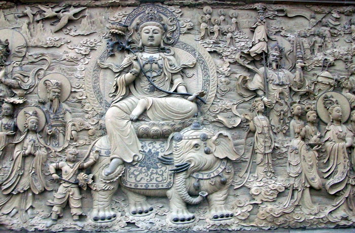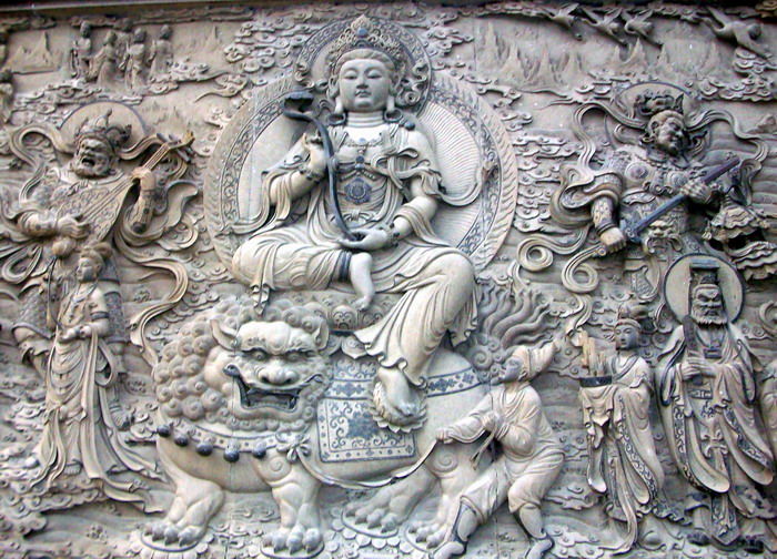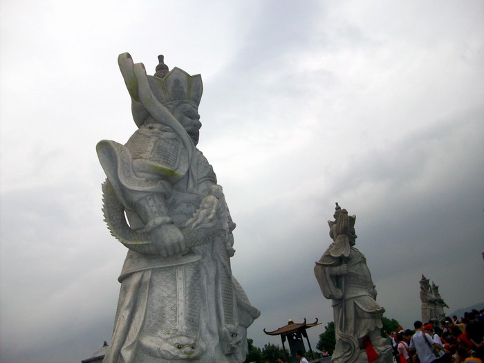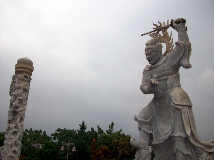 观世音菩萨面朝大海,脚踏莲花,神态雍容,庄重慈祥。站在佛像脚下仰视菩萨,顿觉众生渺小,佛法无边。整个场面极其壮观,给人以壮观,华丽、高耸入云的感觉。前面是雕龙浮凤的汉白玉石牌坊,两旁石狮子助威,还有四大天王保护,其雕刻精细,威风凛凛。