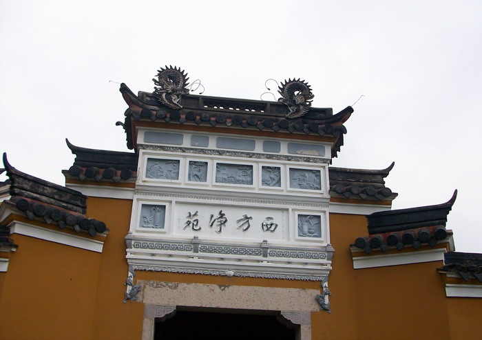 西方净苑,原名西方庵,位于普陀山东南观音跳上,西麓为南海观音铜像。明末清初僧人福升建造,1920年后两次毁于火、风灾。1990年9月10日慧锷大师纪念堂在此落成。