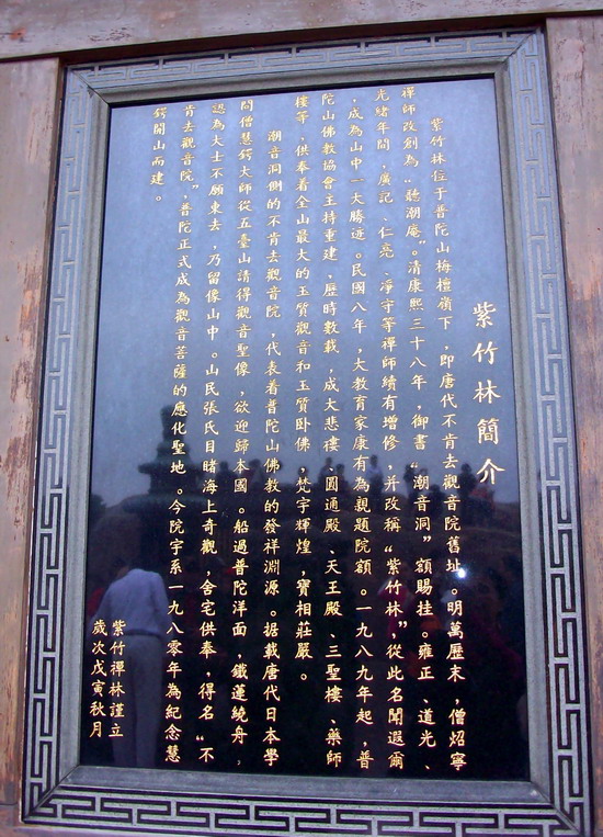 不肯去观音院,据说是岛上第一个寺院,不过现在的不肯去观音院,比较小,是后来重建的。山中岩石呈紫红色,剖视可见柏树叶、竹叶状花纹、因称紫竹石。后人也在此栽有紫竹。五代后梁贞明二年。日僧慧锷从五台山请得观音像,归国途中在此遇风受阻,在此建“不肯去观音院”于紫竹林中。观音院前有潮音洞。紫竹林旁有光明池,南有观音眺,对岸可见洛迦山岛。