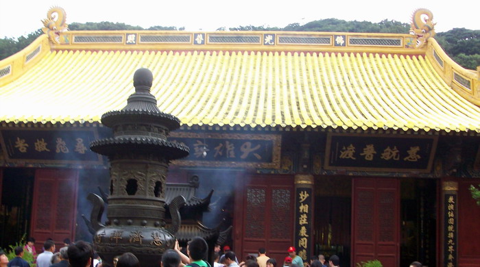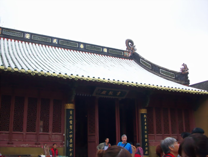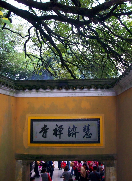 慧济禅寺,又称佛顶山寺,是山上唯一的寺院,原为一石亭,供佛其中,明代僧慧圆创慧济庵,至清乾隆五十八年始建圆通殿、玉泉殿、大悲楼等,扩庵为寺。大雄宝殿屋顶全用天蓝、淡绿、鹅黄、紫红等色琉璃瓦盖成,在阳光下映出万道彩虹,形成“佛光普照”的绮丽景观。
