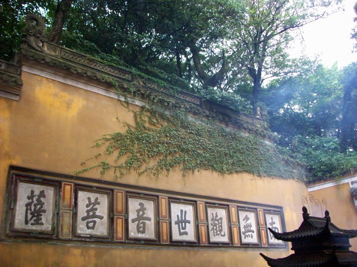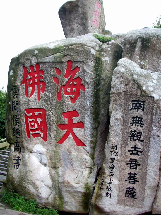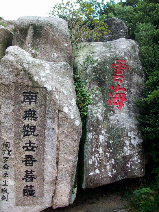 一路从香云路行走下山,行走过半,见到题写着“海天佛国”的巨石,这四个字出自明朝抗倭名将候继光之手,如今海天佛国已经成为专指普陀山的最佳概括,这石上又叠压着一块小石,便是“云扶石”,听说云扶石上还有个小潭,可惜我们高不过它,是看不到啦。