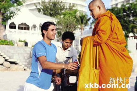 泰国当地时间25日,正在泰国准备出战泰国公开赛的“西班牙天王”纳达尔来到位于泰国南部的海滨度假胜地华欣,参加了一项佛教仪式并向僧侣赠送施舍物。在仪式上,纳达尔双膝跪地显得虔诚无比。