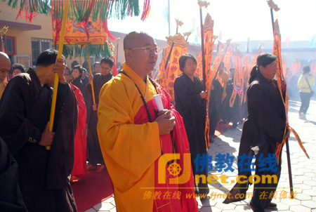 法会首先迎请五位诸山长老和五位护法居士进入主会场。当日会场上空,彩旗飘扬,锣鼓喧天,钟鼓齐鸣;迎请队伍整齐有序、庄严威仪。