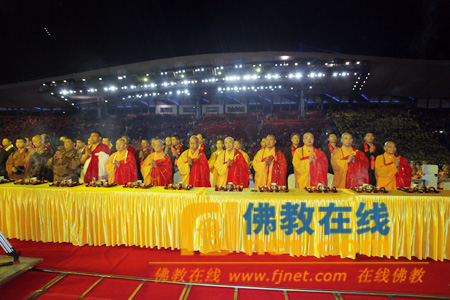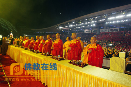 27日晚19时,普佛供灯祈福大典正式开始,现场钟鼓齐鸣,在庄严浩荡的仪仗引请下,主法法师威仪具足缓步登坛主法。中佛协副会长净慧长老、安徽二祖寺绍云长老等三十多位主法法师,将采集自印度恒河的圣水洒向大众。在“南无消灾延寿药师佛”佛号声中,近千余名法师手捧莲花灯绕坛诵经,会场看台数以万计的观众也举起手中莲花灯依次传递,现场呈现出一个灯光闪烁的流动海洋。