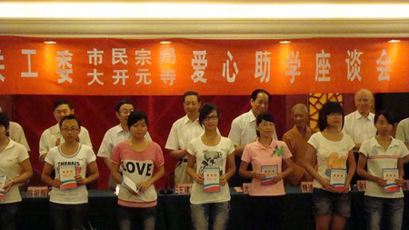 此次“爱心助学”活动的资助对象是2010年参加高考被全日制高校录取的贫困生,今年泉州大开元寺出资10万元用于资助泉州医高专和泉州儿童发展职业学院各25名贫困学生,每人2000元。泉州大开元寺从2008年起便积极参与“百万大手牵小手”关爱活动,累计向泉州市关工委捐赠75万元用于资助贫困学生和病灾儿童。
