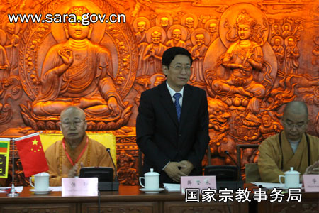 蒋坚永副局长致辞内容如下: 今天,中斯两国佛教界、学术界在佛牙舍利所在地北京灵光寺集会,隆重举行纪念中国东晋著名高僧法显大师西行斯里兰卡1600年学术研讨会,可谓因缘殊胜、法喜遍满。在此,我谨代表中国国家宗教事务局对研讨会的召开表示热烈的祝贺,对各位嘉宾的到来表示热烈的欢迎。 佛教传入中国和斯里兰卡均有2000年以上的历史,两国都有着悠久深厚的佛教文化历史传承。迄今为止,世界公认的仅存的两颗佛牙舍利,一颗在中国的灵光寺,一颗在斯里兰卡的佛牙寺。这足以说明,无论是历史还是现实,中国和斯里兰卡在世界佛教界都有着举足轻重的地位,对佛教的传续和发展都发挥着不可替代的作用。早在1600年前就将中国和斯里兰卡佛教以及两国人民联结在一起的就是中国东晋著名高僧法显大师。今天我们隆重纪念法显大师西行斯里兰卡,就是要进一步发扬法显的精神、沿着法显的足迹、继续深化两国佛教界的友好合作,继续加深两国人民的传统友谊,共同显扬佛法、携手促进和谐。 借此机会,我提几点希望: 第一、希望佛教界发扬法显大师舍身求法、为法忘躯的精神,更加注重勤修三学。中国著名文豪鲁迅先生曾经把舍身求法者称作中国的脊梁,法显大师、玄奘大师都是其中的杰出代表。法显幼年出家,发起西行求法宏愿的时候已过六十岁,并于六十五岁那年踏上了西行求法的征途。同时出发的人,有的中途返回汉地,有的死在路上,有的留在了印度,而大师却矢志不渝,百折不挠,最终完成取经大业。这种为法忘躯的精神令人感佩至深。大师之所以“乘危远迈,策杖孤征”,是有感于当时法本不全,尤其律藏缺乏。为使中土戒定慧三学完具,清净比丘能够如法如律修学,大师发起了深弘的誓愿。今天,在历代高僧大德的努力下,佛教法宝齐备,不再需要舍身远行、求取法本。佛教界应该继承先德留下的宝贵遗产,特别是要发扬法显大师为法忘躯的精神和他对戒律的高度重视,以戒为师,勤修三学,利乐有情,为法忘躯。要念兹在兹,以佛法正信的维护和传续为本分,更加注重提高自身素质,更好地荷担如来家业。 第二、希望佛教界发扬法显大师开拓进取、刻苦钻研的精神,更加注重学术研究。中国佛教自古以来注重学术研究,赵朴老曾把学术研究作为中国佛教一项优良传统而大力提倡。法显不但是一位志行高远的佛教大师,也是一位著名的学术大师、翻译家、著作家。法显取经回国时已经七十八岁,他在临终前的七年多时间里,一直紧张艰苦地进行着翻译经典的工作,共译出了经典六部六十三卷。他翻译的《摩诃僧祗律》,对后世中国佛教界产生了深远的影响。他翻译的六卷《大般泥洹经》阐扬了涅槃思想,使得涅槃佛性论蔚为当时佛教思想的主流。在译经同时,法显还将自己西行求法的见闻写成一部不朽的名著――《佛国记》,在世界学术史上具有重要的地位。它不仅是一部传记文学的杰作,而且是一部重要的历史文献,是研究当时西域和南亚历史极为重要的史料。今天我们应发扬中国佛教注重学术研究的优良传统,继承法显大师开拓进取、刻苦钻研的精神,更加重视学术研究,继续深化讲经交流活动,养成研读经典、讲经说法的风气。努力提高知识水平和人文素养,建设研究型佛教、学习型佛教。 第三、希望佛教界发扬法显大师沟通中外、放眼世界的精神,更加注重国际交流。对外交流也是中国佛教一项优良传统。法显大师是中国最早具有世界眼光和开创中国佛教对外友好交流事业的代表人物之一,玄奘大师、义净大师等均深受其影响。法显大师的足迹遍及当时西域诸国、印度诸国、斯里兰卡和印度尼西亚等国。大师秉承好学敏思、广识博闻的中华传统,一路西行,一路学习,所到之处,不但认真学习当地语言,而且细心观察当地民俗、文化和社会,对于佛教经律论三藏,他更是孜孜不倦、如饥似渴。在师子国(即今天的斯里兰卡),史料记载“法显住此国二年,更求得弥沙塞律藏本,得长阿含、杂阿含,复得一部杂藏,此悉汉土所无者。” 法显西行搭建起一个中外沟通的桥梁。在法显精神的感召下,上个世纪80年代,中国佛教协会派出五比丘踏着法显的足迹远赴斯里兰卡留学,开启了中斯佛教交流的新篇章。今后,希望中国佛教界更好地发扬中国佛教优良传统,更加注重开展国际友好交流,更加注重培养国际交流人才,继续发展和深化同各国佛教界之间的友好交流,进一步走向世界,与各国佛教界深入合作、共创未来。 各位高僧大德、各位专家学者、各位朋友: 法显大师是中斯两国的历史桥梁,是中斯友谊的永久见证。今天中斯两国佛教界在佛牙舍利的灵光照耀下隆重纪念法显大师西行斯里兰卡1600周年,是中斯两国佛教友好交往的生动写照、是中斯两国人民深厚友谊的集中体现。明天,中斯两国在斯里兰卡也将举行一场纪念大会。两相呼应,更加情深意切。 赵朴初先生诗云:“喜见朋来师子国(斯里兰卡),和平世界共心期”,让我们中斯两国人民和两国佛教界继续沿着法显大师的足迹,显扬佛法、携手并进,共同弘扬佛教和谐、慈悲、中道、圆融的核心价值,从心开始,众缘和合,积极为建设一个持久和平、共同繁荣的和谐世界贡献力量。 祝愿中斯两国佛教界的法谊地久天长、祝愿中斯两国人民的友谊万古长青! 谢谢!