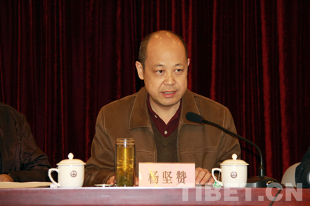 杨坚赞在会上做了《关于藏传佛教高级学衔评审委员会二届五次会议筹备情况的汇报》。他说,这次会议的任务是研究第六届高级班学衔考试、学衔评审、学衔授予等有关事项和工作方案,使藏传佛教学衔制度不断完善和规范,确保第六届高级学衔的授予工作顺利完成。