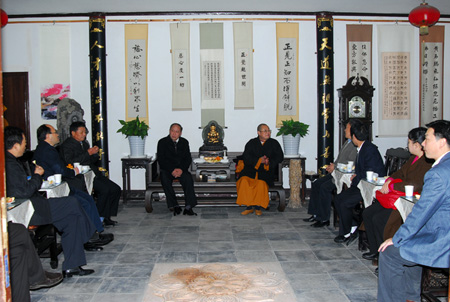 下午,省政协副主席陈春林一行到弘化禅寺进行现场专题调研。弘化禅寺方丈正慈法师在方丈室与调研组进了座谈。陈春林副主席询问了寺院僧人的生活情况,正慈法师向其详细介绍了弘化禅寺僧尼的住众情况及参与社保的情况。