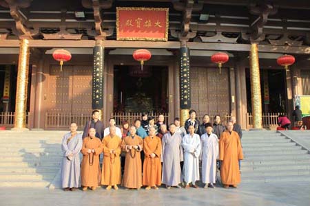 最后大家在大雄宝殿前合影,并由法门寺佛学院训导长法闻法师陪同客人参观寺院、博物馆、景区等。