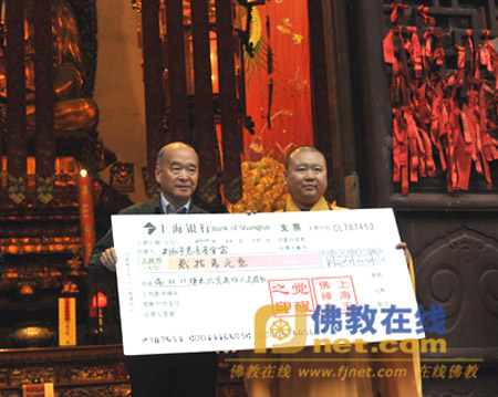 在活动现场,玉佛禅寺全体僧职人员自发地向遇难同胞捐赠,觉醒法师代表玉佛禅寺通过上海市慈善基金会向“11·15特大火灾”遇难人员捐赠人民币20万元,同时向遇难同胞捐赠棉被100余床。市慈善基金会副理事长郭开荣先生代表市慈善基金会接受了捐赠。
