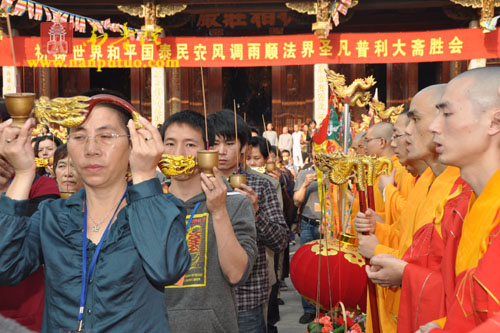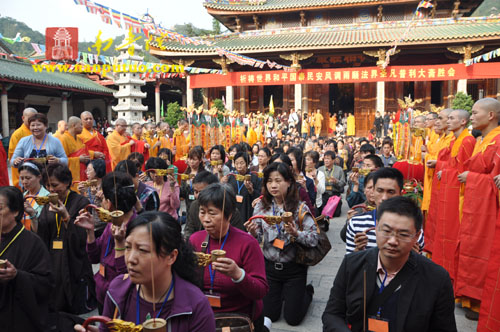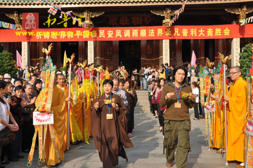 11月19日下午2时30分,南普陀寺隆重举行了此次大斋胜会的熏坛洒净仪式,敦请本寺方丈上则下悟大和尚主法。是时,维那圆满法师举腔,寺内百余位僧众和声齐诵大悲咒,大和尚执持杨枝净水依次遍洒水陆道场所设的各大坛口,并由维那师一一宣读疏文;众斋主在引礼师的带领下依次上香,虔诚礼拜。道场数百游人信众恭逢盛会,同沾法喜。