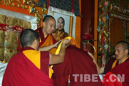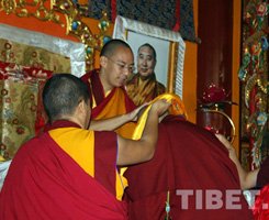 中国佛教协会副会长、第十一世班禅额尔德尼·确吉杰布接受第六届高级学衔获得者的朝拜