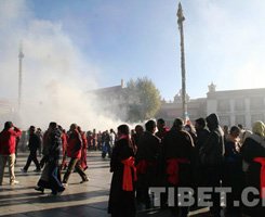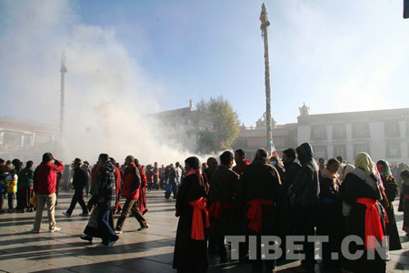 记者看到,上午9点的大昭寺广场早已人流如织,经筒飞转,诵经声不绝于耳。“神降节”这一天,最重要的祈愿活动之一就是煨桑。只要有煨桑炉的地方,转经人就会将带来的柏枝投入炉中,并撒上青稞粒、糌粑,倒上酥油等。整个大昭寺周边的煨桑炉,香烟缭绕,空气中弥漫着桑烟的淡淡清香。