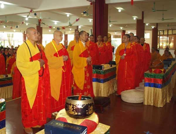 2010 年10月31日(农历九月廿四)15时,厦门市石室禅院隆重举行了首届“法界圣凡水陆空普度大斋胜会”熏坛洒净仪式。法会恭请厦门市佛教协会常务副会长、厦门观音寺住持定恒大和尚、本寺住持忠明大和尚、江苏天宁寺首座心愿大和尚为主法大和尚,在来自各地名山的108位大德高僧与参加本法会的十方善信千余人,在钟鼓声中齐聚弘法讲堂(本法会梁皇大坛及消灾延寿坛)内,举行了庄严殊胜的洒净结界仪式。厦门市民宗局蔡永华副局长、海沧区民宗局沈瑶局长应邀莅临法会现场,对此次大法会予以视察及指导,同时在洒净仪式进行中,厦门市佛教协会会长、南普陀寺方则悟大和尚亦亲至药师密坛内拈香加持,并祈愿本次大法会功德圆满!